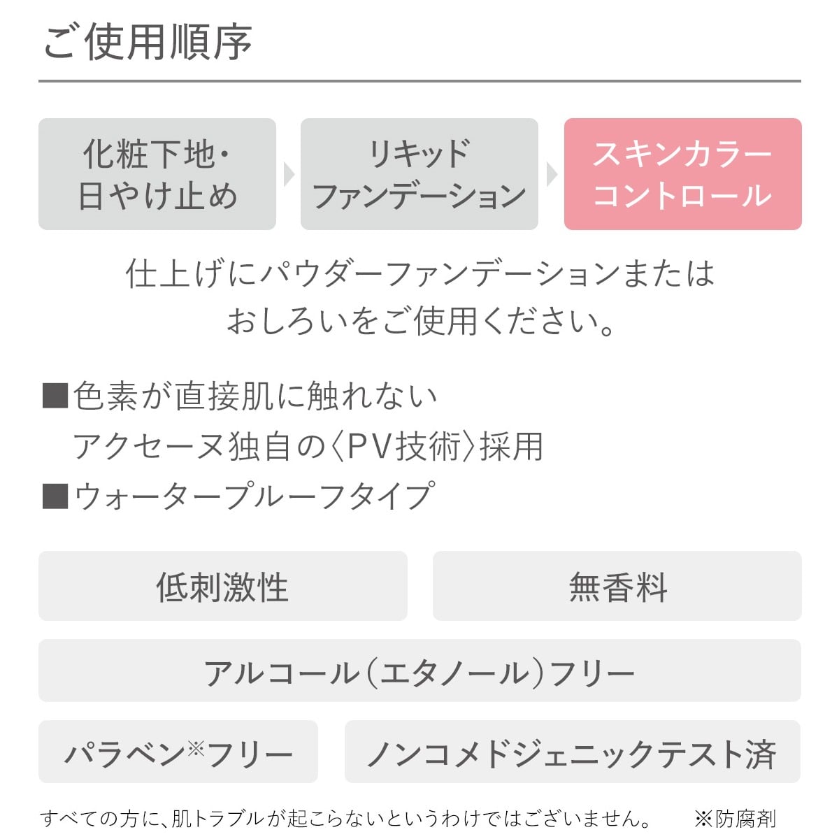 น้ำ, ไซโคลเพนตาไซลอกเซน, ไดเมทิโคน, กลีเซอรีน, ไตรเอทิลเฮกซาโนอิน, บิวทิลีนไกลคอล, บิส(บีเฮนิล/ไอโซสเตียริล/ไฟโตสเตียริล) ไดเมอร์ ไดลิโนเลอิล ไดเมอร์ ไดลิโนเลเอต, พีอีจี-10 ไดเมทิโคน, ไดเมทิโคน/ไวนิล ไดเมทิโคน ครอสพอลิเมอร์, โพลีควอเทอร์เนียม-51, อะลูมิเนียมไฮดรอกไซด์, แมกนีเซียมซัลเฟต, ซอร์บิแทน ไอโซสเตียเรต, ซิลิกา, เทรเมลลา ฟูซิฟอร์มิส โพลีแซคคาไรด์, ไดสเตียร์ไดโมเนียม เฮกโทไรต์, ไดไอโซโพรพิล ไดลิโนเลเอต, พาราฟิน, ลอริล พีอีจี-9 โพลีไดเมทิลไซลอกซีเอทิล ไดเมทิโคน, โทโคฟีรอล, ฟีนอกซีเอทานอล, ไทเทเนียมไดออกไซด์, เหล็กออกไซด์